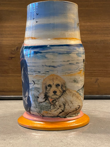 This piece was handmade/one of a kind, thrown on a wheel. Hand painted with Amaco underglazes. This piece was inspired by my trip to Ventura Beach in CA! I loved seeing all the dogs playing in the sand! Made with Nara Porcelain.