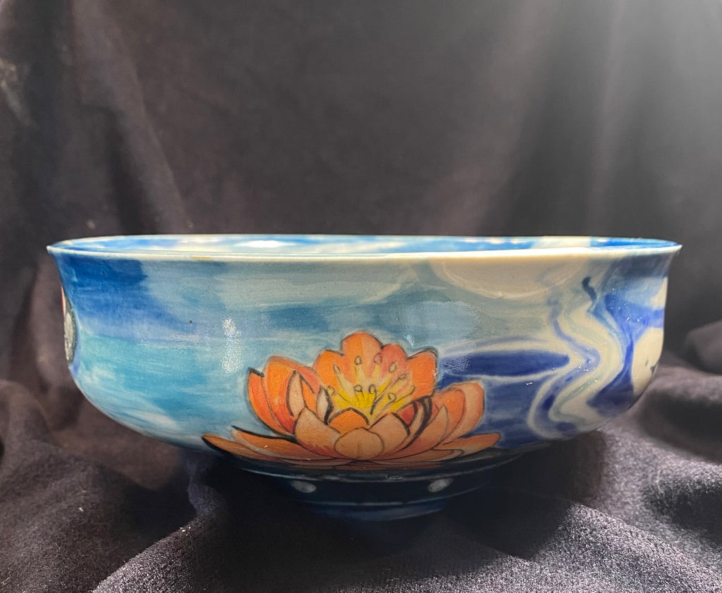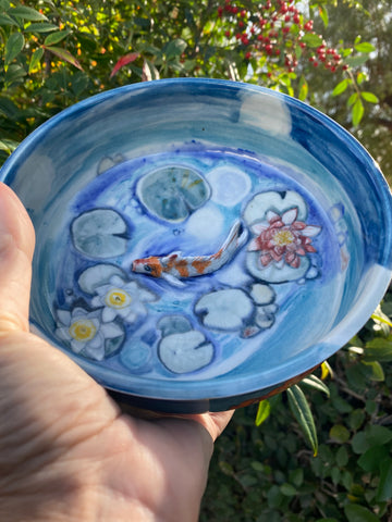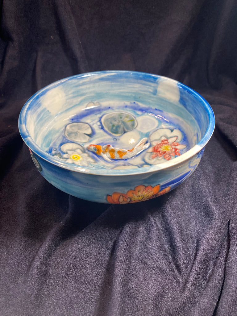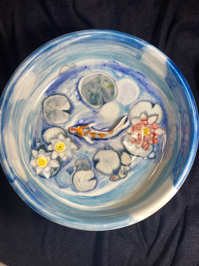 This piece was handmade/one of a kind, thrown on a wheel. Hand painted with Amaco underglazes. Hand sculpted Koi Fish. Made with Nara Porcelain.